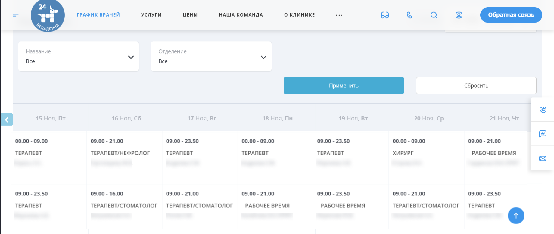 Отражение на сайте актуального расписания врачей.