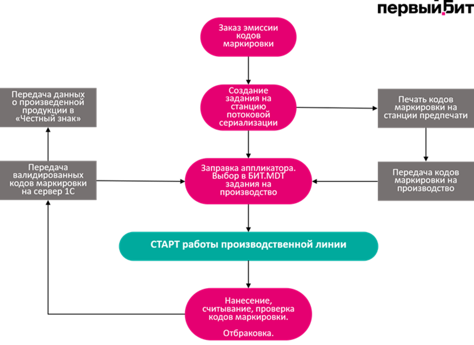• Заказ эмиссии кодом маркировки происходит на АРМ оператора в «Честный Знак» через программу «1С:Комплексная автоматизация». После чего эмитированные коды маркировки отправляются на станцию предпечати. В это время оператор, используя функционал БИТ.MDT, создает задание на производственную линию (станция потоковой сериализации), и отдает распечатанные коды маркировки на производство.