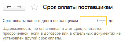 Если перейти по данной гиперссылке, то в открывшемся окне можно будет указать или изменить сроки оплаты. На примере указан срок оплаты конкретному поставщику.