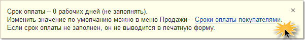 Если зайти на вкладку «Счет покупателю», то там также есть возможность для установки сроков оплаты. И это не требует каких-либо настроек функциональности программы. Если при этом нажать на знак вопроса, то отобразиться подсказка с гиперссылкой, где можно также выполнить настройки сроков платежей или перейти в меню настройки непосредственно оттуда.
