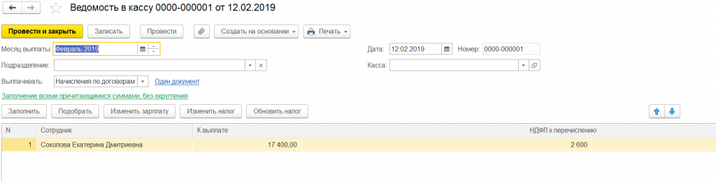После этого по нажатию кнопки «Выплатить», создадим ведомость в кассу на выплату.